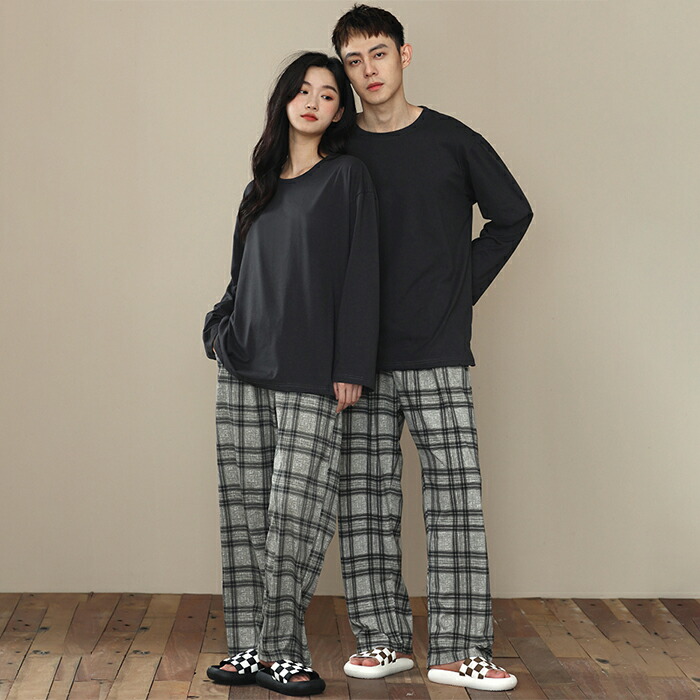 ペアパジャマ カップル ルームウェア レディース メンズ 上下セット シンプル 格子柄 カジュアル ペアルック 長袖 部屋着 ナイトウエア 大きいサイズ 結婚祝い プレゼント クルーネック ins 春