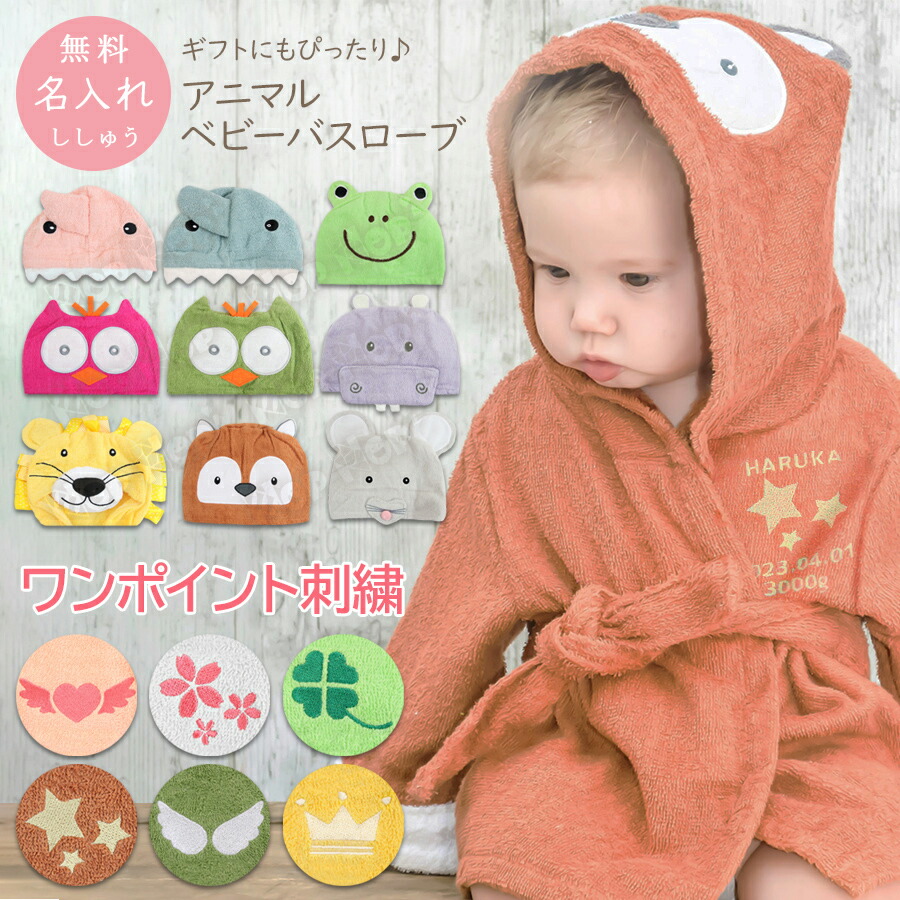 お風呂上がり や プール や 水遊び に 出産祝い 誕生日プレゼント 自宅用 ベビー バスローブ 名入れ無料 刺繍無料 綿100% フード付きタオル ワンポイント 動物