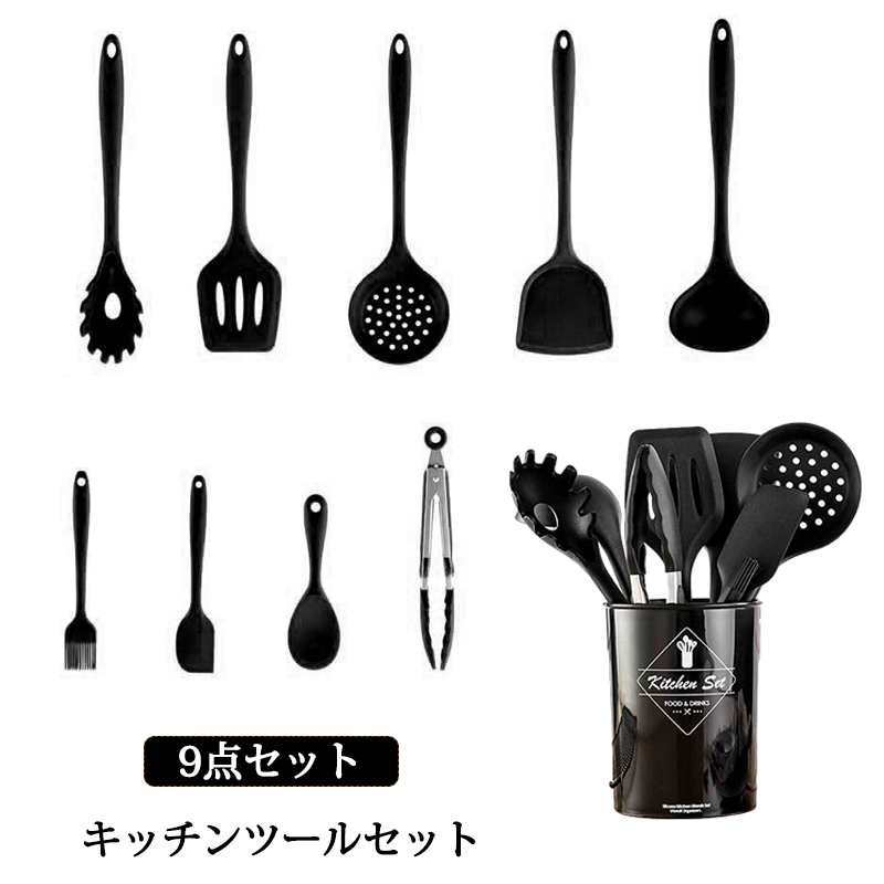キッチンツール 9点セット シリコン製 キッチンツールセット 収納容器付き キッチン用品 安全素材 台所用品 耐熱シリコ 調理 料理 製菓器具 クッキング用品 フライ返し スプーンおたま トング 泡立