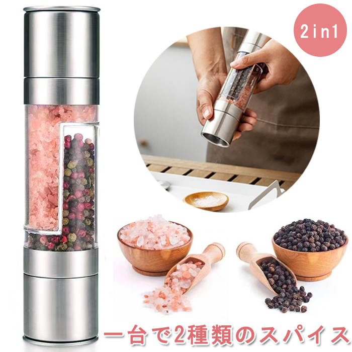 一台2種類のスパイス ペッパーミル 手動 透明 小型 2in1 1台2役 おしゃれ ステンレス 粗さ調節 洗いやすい