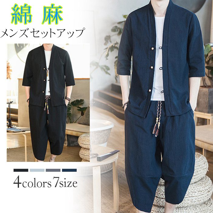 綿麻上下セット セットアップ リネン 夏 半袖 セットアップ メンズ 甚平風 綿麻リネン メンズ 上下セット 無地 前開き カジュアル 部屋着 ルームウエア メンズ 7分丈 父の日 プレゼント