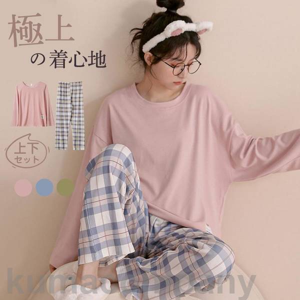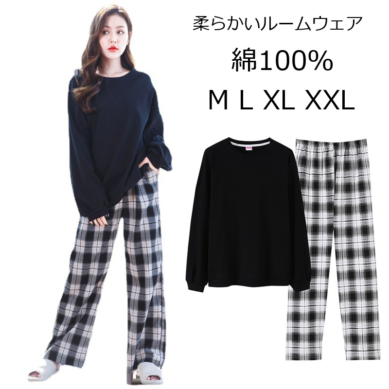 ルームウェア パジャマ レディース チェック柄 上下セット 長袖 長ズボン 春 秋 冬 部屋着 寝間着 通気性 ゆったり 外出 柔らかい