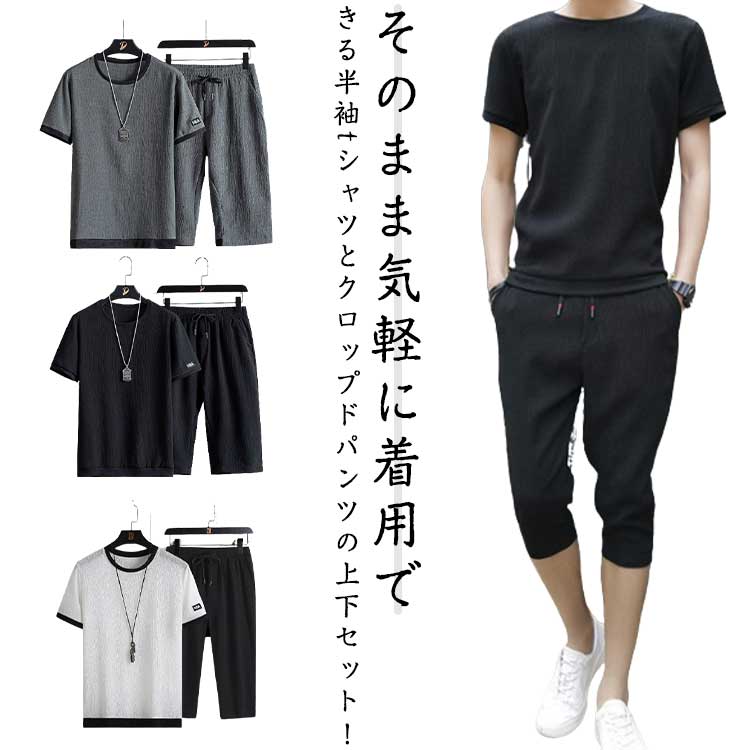 接触冷感 セットアップ メンズ カジュアル 夏服 上下セット ラウンドネック 半袖 tシャツ 7分丈パンツ
