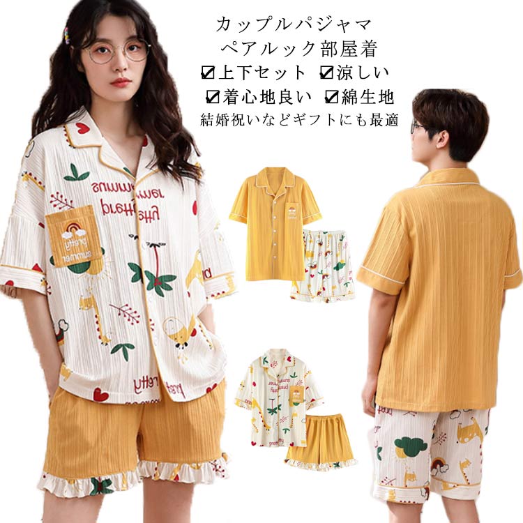 カップルパジャマ レディース メンズ ルームウェア 上下セット 2点セット ナイトウェア 涼しい 綿生地 セットアップ 部屋着 ゆったり 可愛い 半袖 シャツ パンツ 春夏秋冬 柔らかい 軽い 寝間