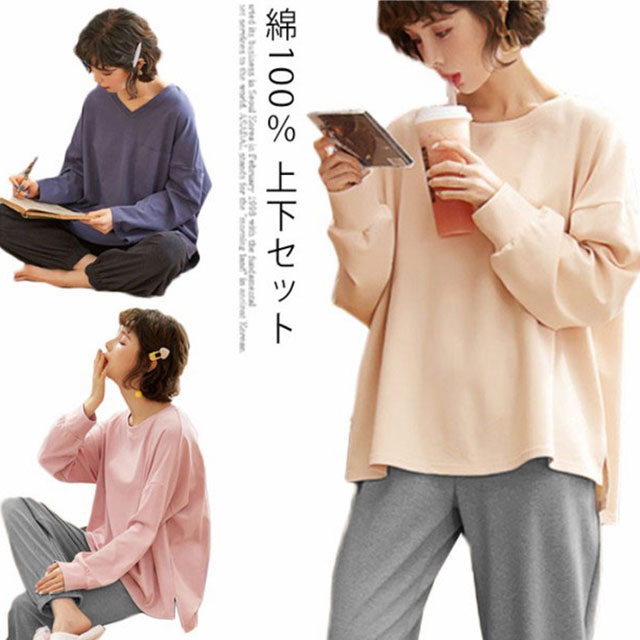 コットン100% 上下セット セットアップ Tシャツ パジャマ サルエルパンツ 部屋着 リラックス ピンク ベージュ ネイビー 大きいサイズ M L XL 2XL