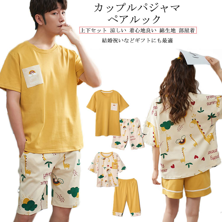 カップルパジャマ レディース メンズ ルームウェア 上下セット 2点セット ナイトウェア 涼しい 綿生地 セットアップ 部屋着 ゆったり 可愛い 半袖 tシャツ パンツ 春夏秋冬 柔らかい 軽い 寝間