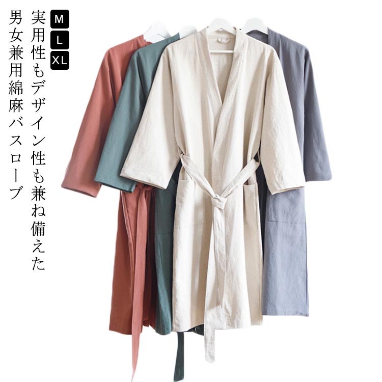 M L XL 男女兼用バスローブ 通気 ロング丈 薄手 吸水 浴衣 綿麻インナー 下着 ナイトウェア レディース ナイトウェア ルームウェア バスローブ
