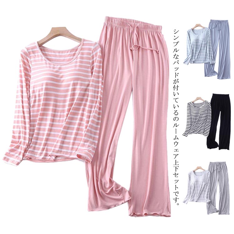 ルームウェア レディース パッド付き 長袖 パジャマ 上下セット Tシャツ ロングパンツ カットソー 部屋着 寝巻き 春秋冬 ヨガウェア ストレッチ ストライプ柄 おしゃれ シンプル