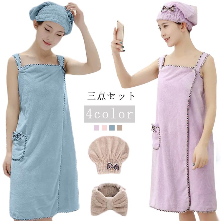 バスローブ 着る バスタオル 大判 小物 着られる バス お風呂あがり バス お風呂 シャワー ワンピ タオル ドライキャップ タオルワンピ シャワーあがり お得な3点セット