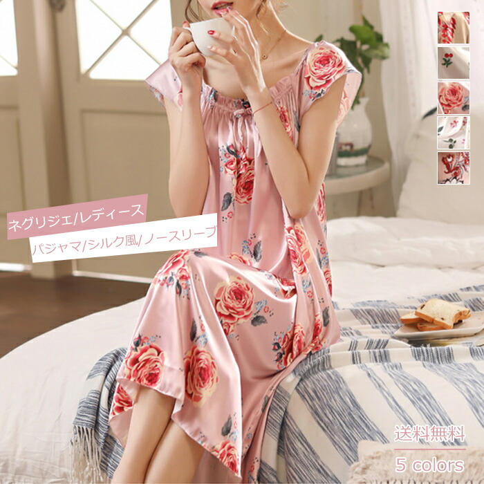 ネグリジェ レディース パジャマ シルク風 ノースリーブ 部屋着 花柄 ロング丈 ルームウェア ひんやり カジュアル 薄∈ 大きいサイズ オシャレ