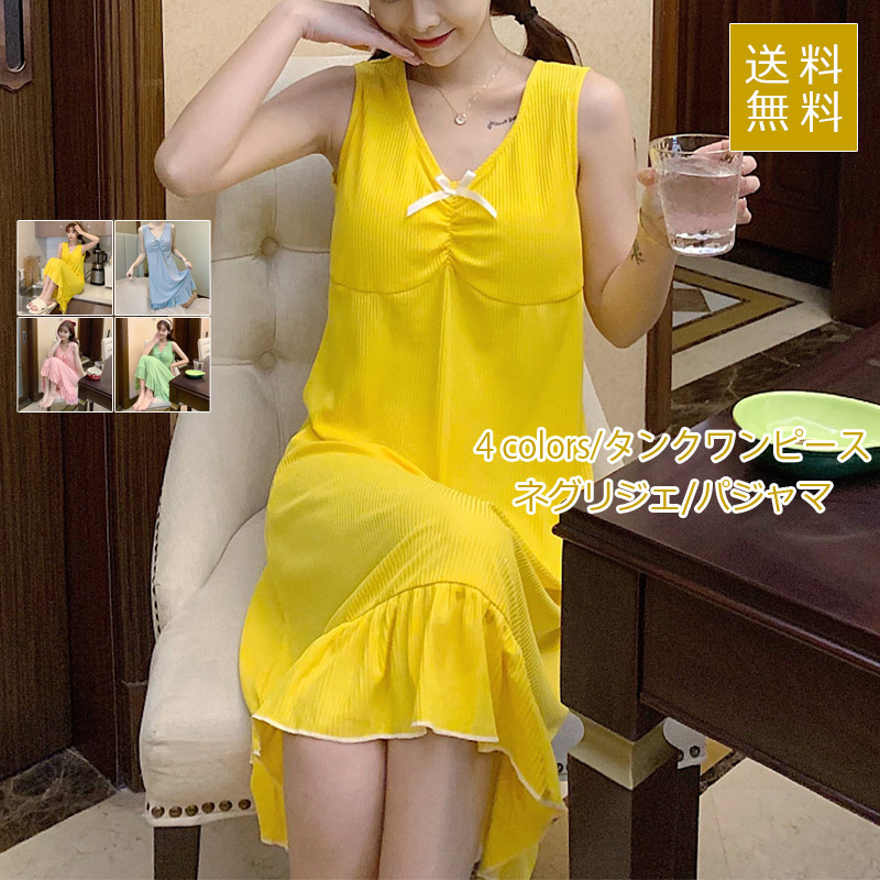 ネグリジェ レディース パジャマ タンクワンピース Vネック 無地 フリル 部屋着 ロング丈 ルームウェア カジュアル ゆったり おしゃれ