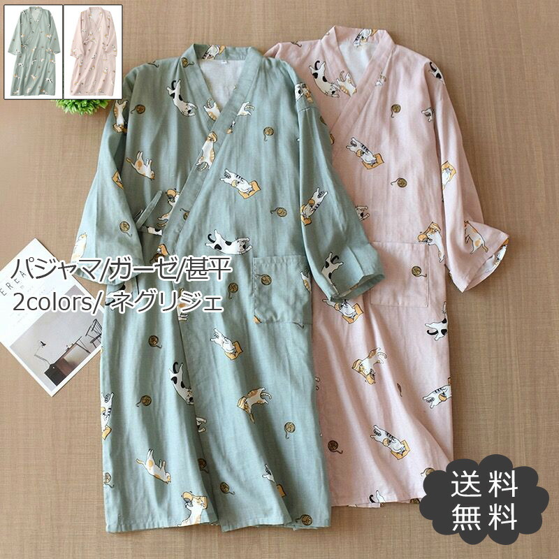 ルームウェア レディース 浴衣 ガウン 和装 パジャマ 寝間着 ネグリジェ レディース パジャマ ガーゼ 甚平 猫柄 シンプル ネック ポケット付き 前開き 部屋着 カジュアル 薄手 柔らかい きれ