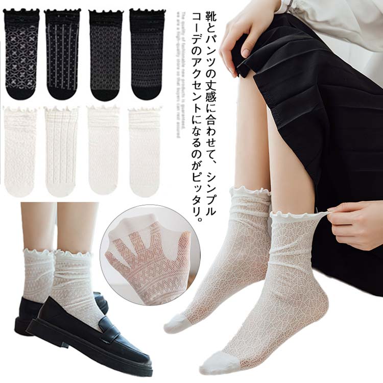 靴下 レディース シースルーソックス シースルーくつした 薄手 通気性 4足セット ソックス 透け感 フリル レース 蒸れない くつ下 春夏ソックス 黒 白 透明 春夏秋 靴下