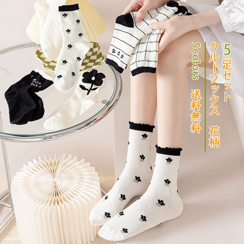 クルーソックス 5足セット レディース 靴下 花柄 白 黒 ショートソックス ルーズソックス 可愛い 綿 春夏秋冬 美脚 きれいめ おしゃれ