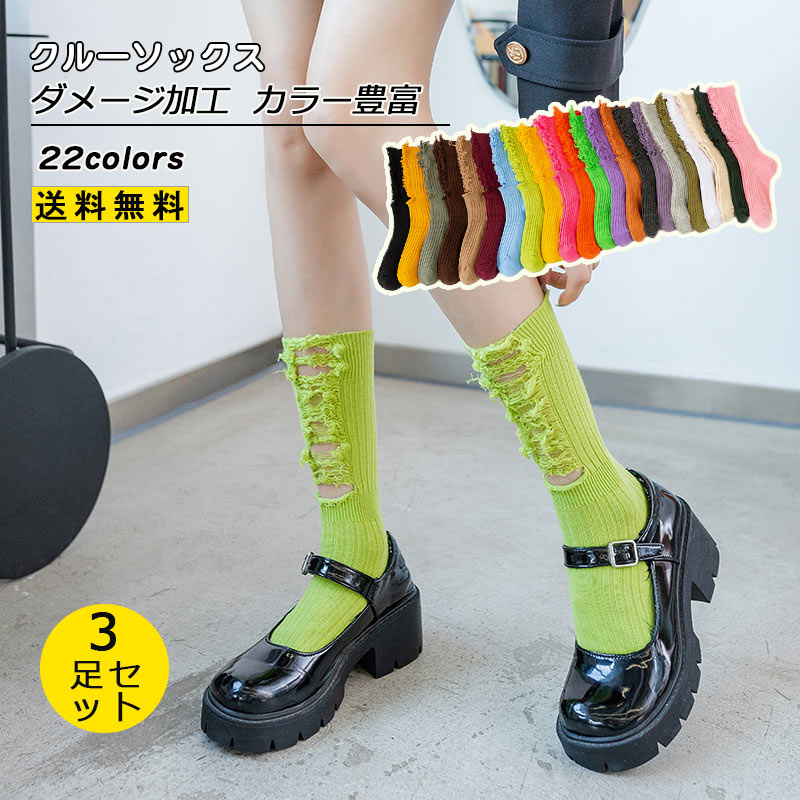 クルーソックス レディース 3足セット 靴下 ダメージ加工 ショートソックス 綿 春夏秋冬 可愛い 個性的 カジュアル 美脚 きれいめ おしゃれ