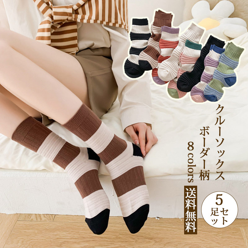 クルーソックス 5足セット レディース 靴下 ボーダー柄 ルーズソックス バイカラー 可愛い ショートソックス 綿 春夏秋冬 美脚 きれいめ おしゃれ