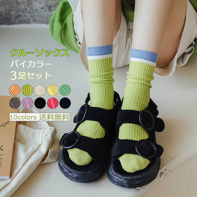 クルーソックス 3足セット レディース 靴下 ルーズソックス バイカラー シンプル ショートソックス 綿 春夏秋冬 美脚 可愛い きれいめ おしゃれ