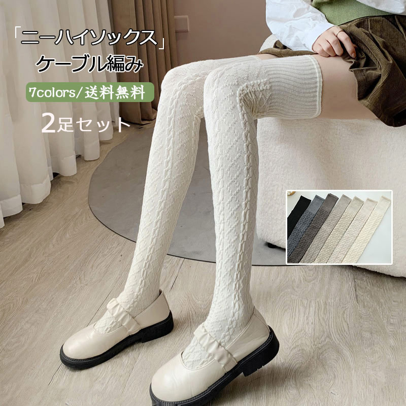 ニーハイソックス 2足セット レディース 靴下 ケーブル編み 無地 厚手 暖かい 秋冬 可愛い 保温 防寒 膝上 ルーズソックス きれいめ おしゃれ