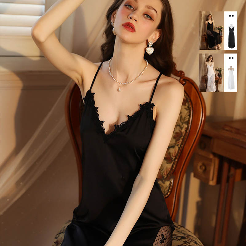 セクシー ランジェリー 深v スリット ベビードール サテン スリップ キャミソール レース ベビードール セクシー