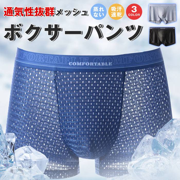 ボクサーパンツ メンズ 接触冷感 メッシュ 3枚セット 薄め 通気性 前閉じ 下着 アンダーウェア 涼しい 快適 吸汗 速乾 無地 夏 蒸れない