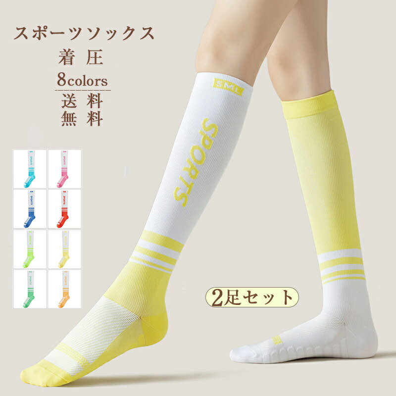 スポーツソックス ハイソックス 2足セット 靴下 レディース 着圧ソックス 滑り止め ヨガ 可愛い バイカラー 春夏秋冬 美脚 きれいめ おしゃれ