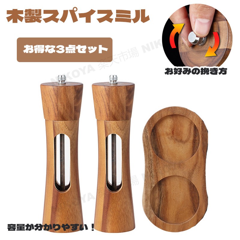 受け皿付きのお得な3点セットペッパーミル 容量見え スパイスミル 手動 木製 ソルトミル 胡椒ミル 黒胡椒 ミル 調味料挽き 岩塩 塩 コショウ 粗びき 簡単に調整 グラインダー 粗さ調節