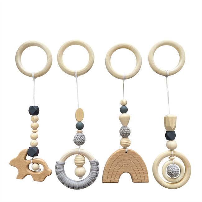 6色展開ベビージム 木製ぶら下げおもちゃ 4点セット 赤ちゃん 木製 レタービーズ綿糸木製リングティーザー 子供用フィットネス機器 ペンダント フィットネスフレーム装飾ぶら下げ 知育玩具