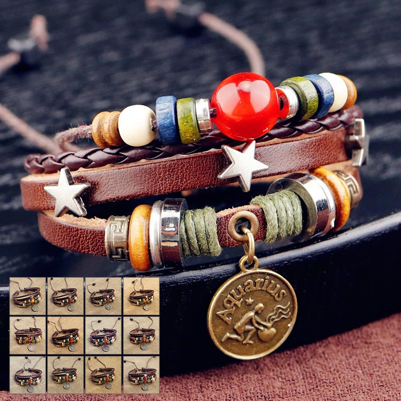 ブレスレット メンズ 星座 ジュエリー レザー ビンテージ チャーム レトロ シンプル 大人 トレンド おしゃれ かわいい かっこいい 12星座 牡羊座 牡牛座 双子座 蟹座 獅子座 乙女座 天秤座