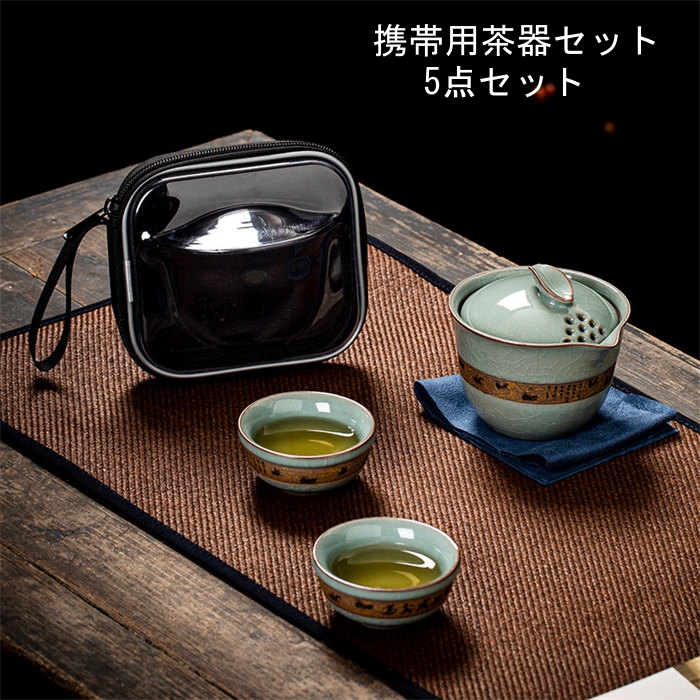 携帯用茶器セット茶芸 陶器 旅行 収納バッグ付き カンフー茶5点セットコンパクト ティーポット 携帯式 軽量 通勤 お出かけ用茶器セット 贈り物 来客 事務室用旅行アウトドア先便利シンプル 湯呑みセッ