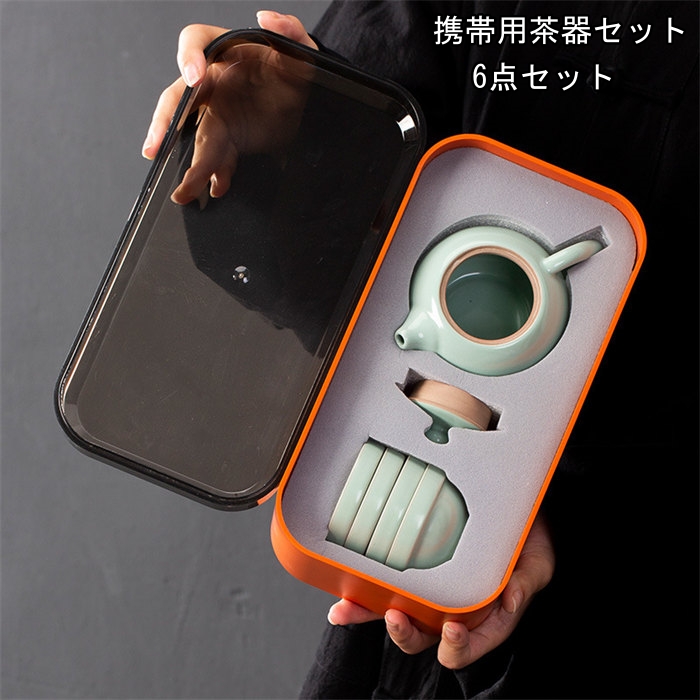オレンジ ブルー携帯用茶器セット茶芸 陶器 旅行 収納バッグ付き カンフー茶6点セットコンパクト ティーポット 携帯式 軽量 通勤 お出かけ用茶器セット 贈り物 来客 事務室用旅行アウトドア先便利シン