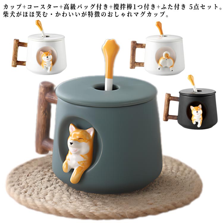 5点セット コップ マグカップ 北欧 おしゃれ 柴犬柄 カップ コースター 高級バッグ付き 攪拌棒1つ付き ふた付き ティーカップ 敬老の日 ギフト