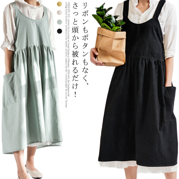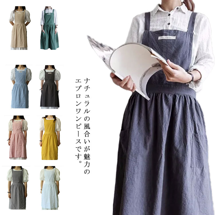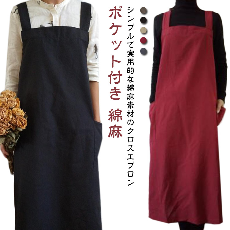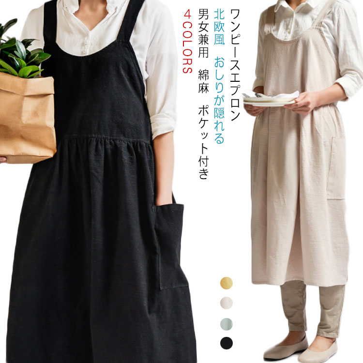 エプロン リネン 北欧風 お尻が隠れる H型 カフェエプロン ロング丈 無地 ポケット付き おしゃれ シンプル ナチュラル レディース 業務用 花屋 サロン 保育士 ソムリエ 美容師 エプロンワンピー