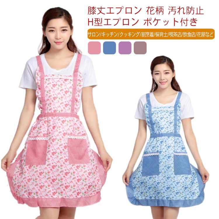 エプロン H型エプロン ワンピースエプロン 汚れ防止 レディースエプロン 花柄 ワークエプロン 膝丈エプロン ソムリエエプロン ミドル ポケット付き サロン キッチン クッキング