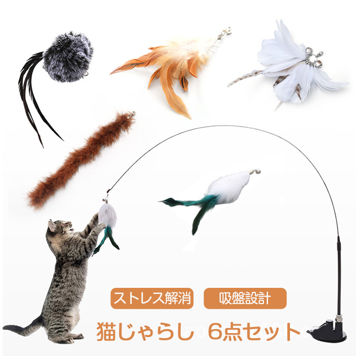 猫じゃらし 吸盤 固定 釣り竿 6点セット 鈴付き 猫 猫用おもちゃ 羽根 ねこじゃら ネコ しなやか