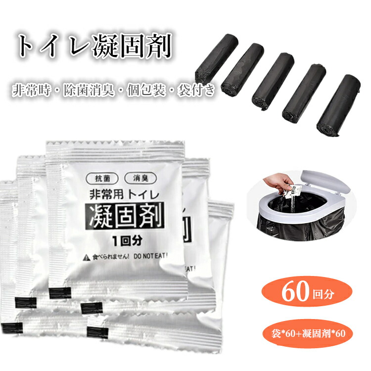 凝固剤 *60枚+汚物袋*60枚 備えて安心 非常用トイレ 水なしでも使える 凝固剤 黒い 消臭 ポリ袋