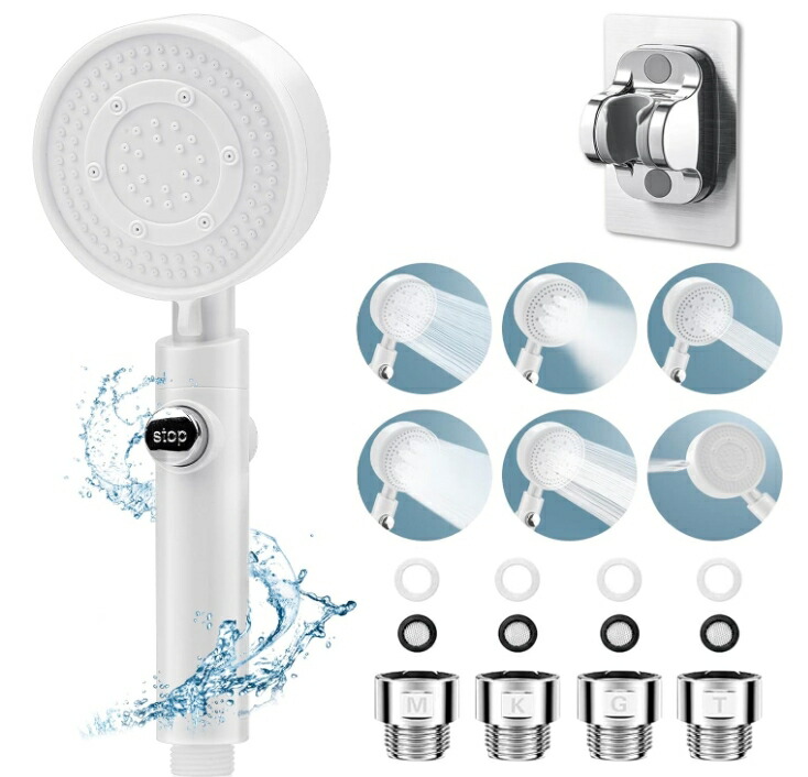 シャワーヘッド 節水 シャワー 増圧 6階段モード 水流調整 角度調整 しゃわーへっど 一時止水 高水圧 マイクロバブル 水漏れ防止 極細水流 アダプター付き シャワーフック付き 国際基準