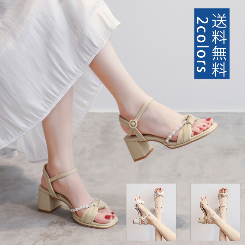 太ヒール レディース スクエアトウ ストラップサンダル パールモチーフ 大人 おしゃれ 合皮 サンダル