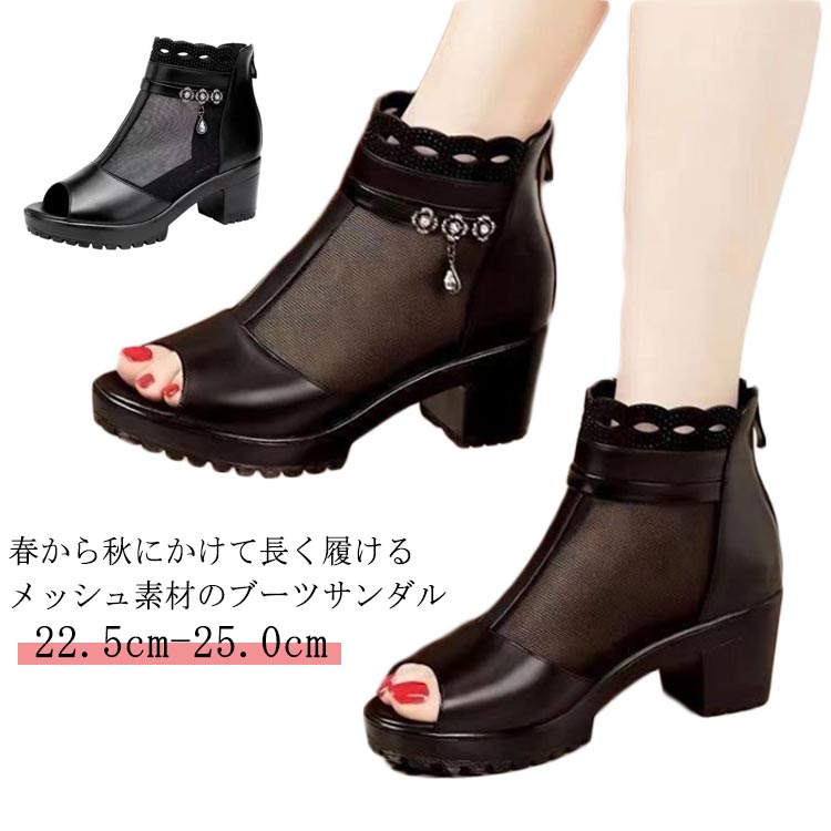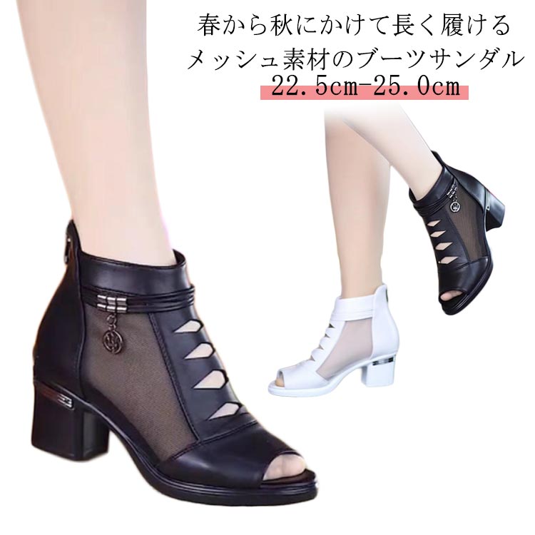 サンダル 黒 白 ブラック ホワイト シューズ ブーツサンダル メッシュ 夏 太めヒール 歩きやすい オープントゥ