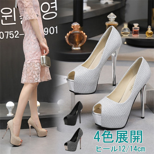 シルバー ブラックキャバ サンダル( 12 14ヒール ) パンプス ストーム厚底 靴 脱げない オープントゥ ハイヒール 結婚式 前厚 キャバシューズ ピンヒール オフィス 美脚 ブライダルシュ