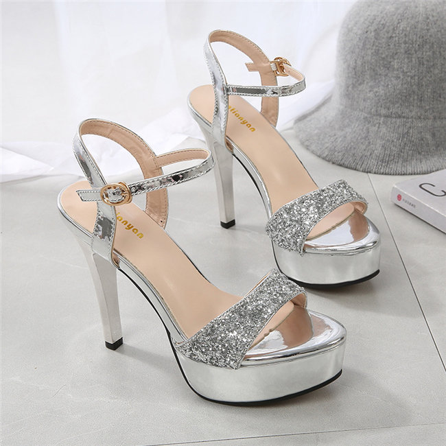 シルバー ブラックキャバ サンダル( 12cm 14ヒール ) パンプス ストーム厚底 靴 脱げない オープントゥ ハイヒール 結婚式 前厚 キャバシューズ ピンヒール オフィス 美脚 ブライダルシュ