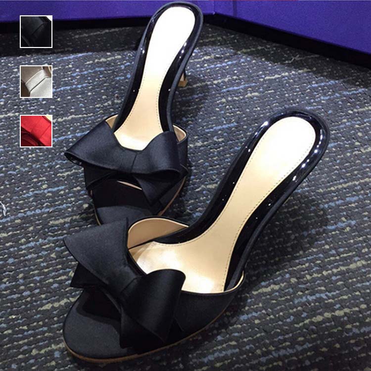 リボン サンダル レディース 靴 ハイヒールミュール 歩きやすい サテン ピンヒール 4.5cmヒール 6.5cmヒール 8.5cmヒール 美脚