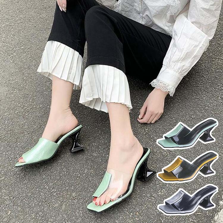 ハイヒールサンダル レディース 靴 美脚 6.5cmヒール シースルーミュール 歩きやすい 太ヒール ビニール パーティー