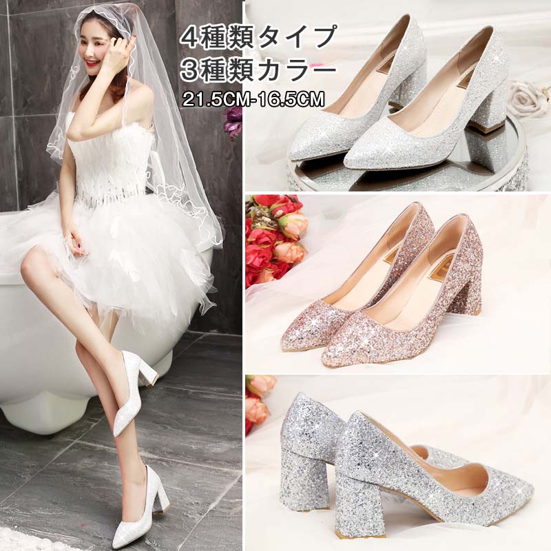 ウェディングシューズ ブライダルシューズ ハイヒール パンプス 白 金色 銀色 チャンキーヒール サンダル レディース つっかけ スパンコール ポインテッドトゥ 結婚式 花嫁