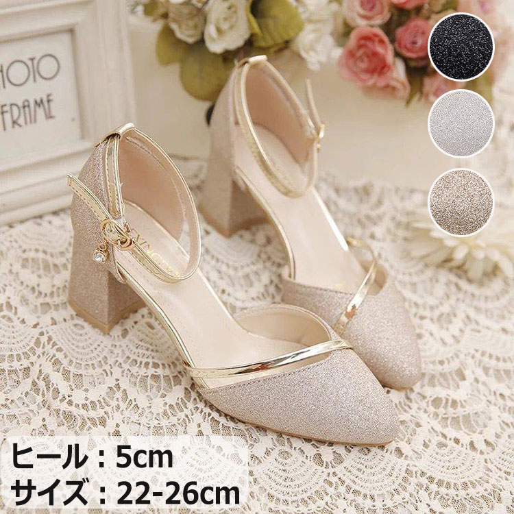 パンプス チャンキーヒール フォーマル レディース ラメ きれいめ ストラップクローズドトゥパンプス プロムにぴったりなドレスシューズ