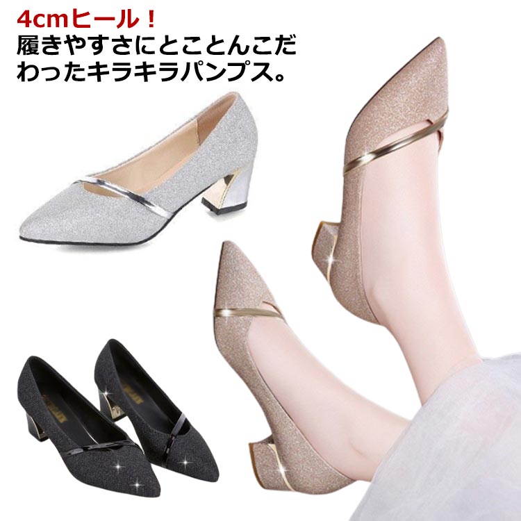 4cmヒール 内寸220-250mm キラキラパンプス フォーマル 美脚靴 レディース靴 パンプス