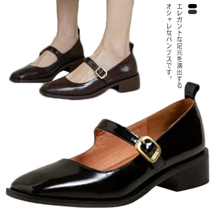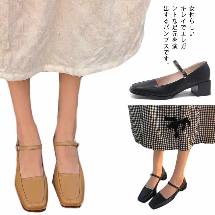 パンプス ストラップ レディース 太めヒール スクエアトゥ 甲高 幅広 美脚 ヴィンテージ おしゃれ シンプル 履きやすい 歩きやすい 通勤 オフィス フォーマル 冠婚葬祭 ブラック 黒 春夏秋 20