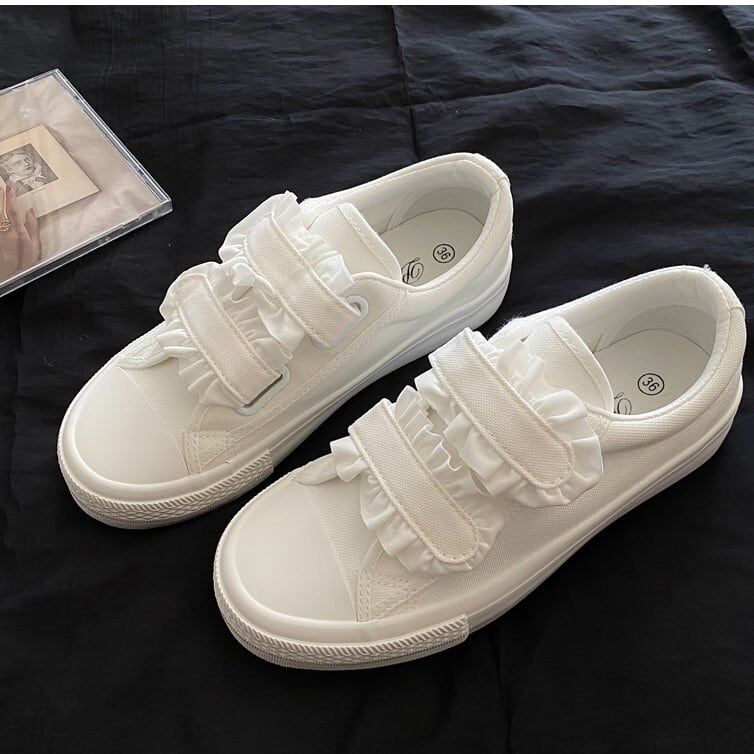 レディース スニーカー スリッポン デッキシューズ 2.5cmヒール ダブルベルト マジックテープ フリル 歩きやすい かっこいい カジュアル 大人 流行り 上品 きれいめ シンプル クラシック