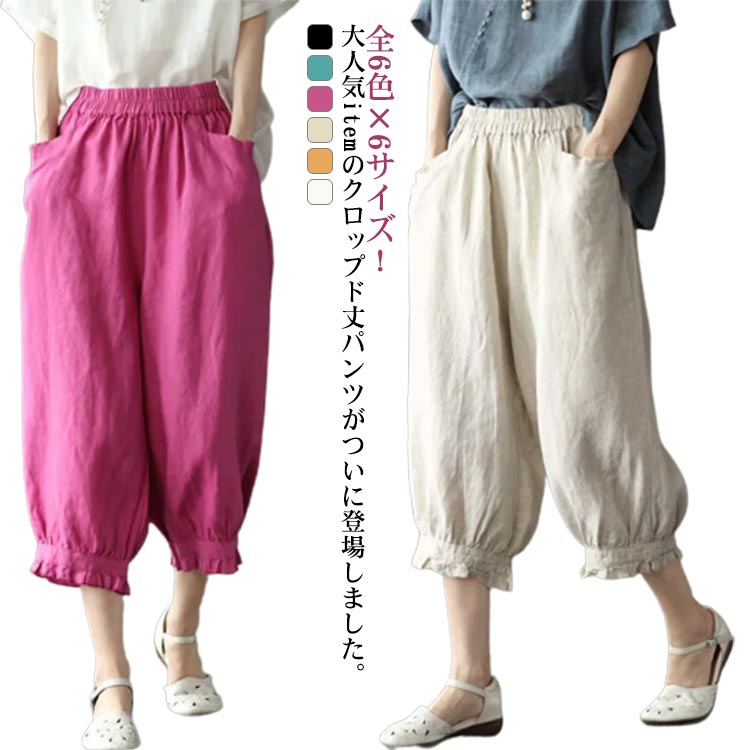 クロップドパンツ レディース サルエルパンツ 七分丈 ワイドパンツ カジュアルパンツ 7分丈パンツ 薄ウエストゴム 裾フリル 薄手 夏用 春夏 シンプル 無地 体型カバー