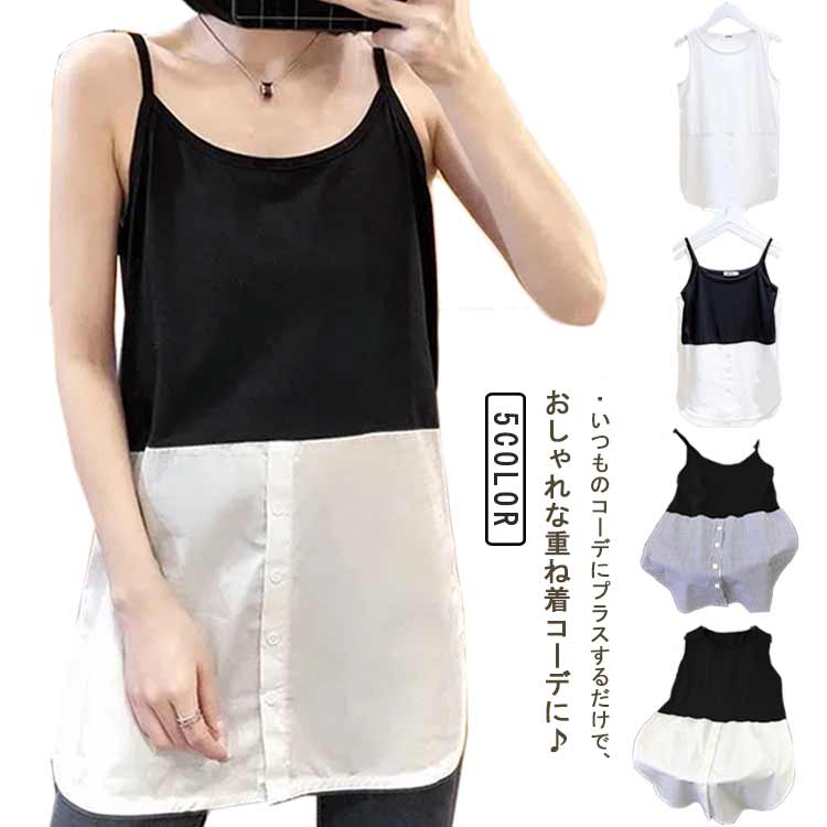 レイヤード タンクトップ レディース ロング キャミソール 重ね着 ストライプ タンク シャツ ラウンドヘム インナー トップス ノースリーブ つけ裾 付け裾 お尻が隠れる 体型カバー 春