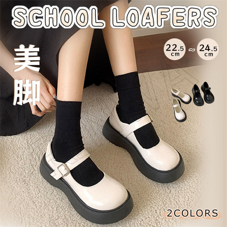 ファッション レディース トレンド フェイクレザー 革靴 厚底 太ベルト ラウンドトゥ カジュアル フォーマル 制服 ガーリー おしゃれ ブラック ホワイト